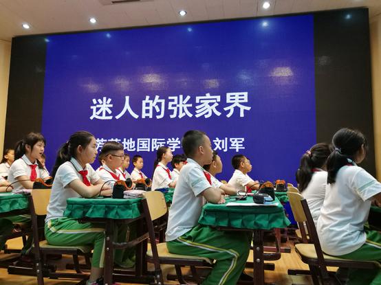 在《迷人的张家界》里,刘军校长带领学生利用微视酷VR设备感受张家界的奇山秀水。学生在多角度的观察、多形式的表达中,增强了探索兴趣,对课文写法有了更深层次的理解,并尝试运用。“山奇、水秀、物丰”的形象更是勾起了大家对张家界的无限向往。