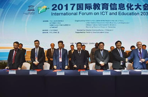 2017国际教育信息化大会于7月10日在青岛开幕。本次会议由中国教育部、联合国教科文组织、中国联合国教科文组织全委会和山东省教育厅主办,青岛市教育局承办。来自全球80多个国家、地区的行政官员、专家学者、校长和教师代表共400余人参加会议。中国教育部副部长杜占元,联合国教科文组织第38届大会主席希玛塔,联合国教科文组织执行局主席沃布斯,青岛市委副书记、市长孟凡利,古巴教育部副部长佩雷斯,中国联合国教科文组织全委会秘书长杜越,山东省教育厅副厅长郭建磊,青岛市委常委、市教育局局长邓云锋出席开幕式。